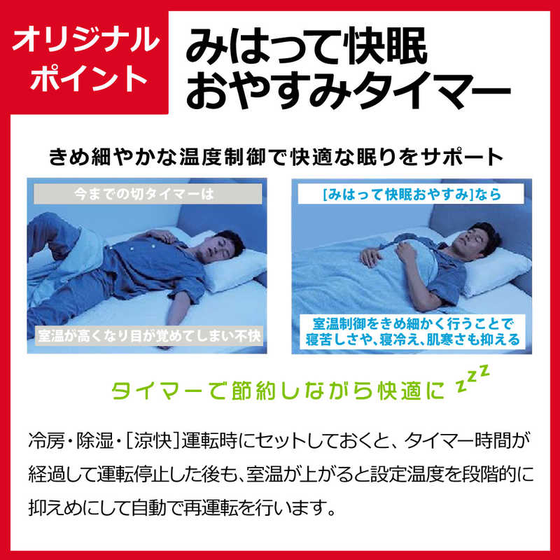 ■【オリジナルポイント】[みはって快眠おやすみ]タイマー 冷房・除湿・[涼快]運転時にセットしておくと、タイマー時間が経過して運転停止した後も、室温が上がると設定温度を段階的に抑えめにして自動で再運転を行います。